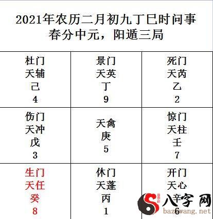 例:2021年农历二月初九丁巳时问事。立春中元,阳遁三局。