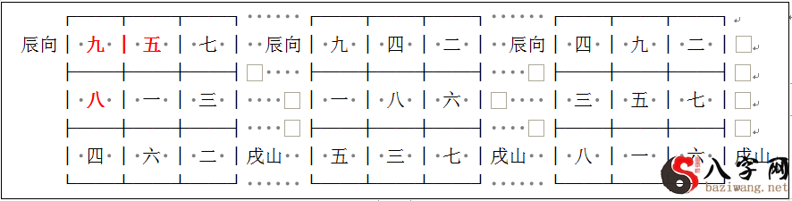 第二种状况,向方两侧正大门或副大门仅有一旁的可以用大门诀;例如一运戌山辰向,向星为九,两侧同元招标方为八、同元丙方为五(中午最左图)。八之后天八卦艮卦地元龙丑为阴,故八逆飞旺星一到招标方,甲能为辰向的副大门(下图中图)。丙方为阳,而五逢阳顺飞(留意,这也是一种特殊情况,五在后天八卦无精准定位,其按丙方的阳阴定阳阴,余仿此)九到丙(下面的图下图),九并不是旺星一到丙方,丙不可以为大门。因而向方仅有副大门而沒有正大门。